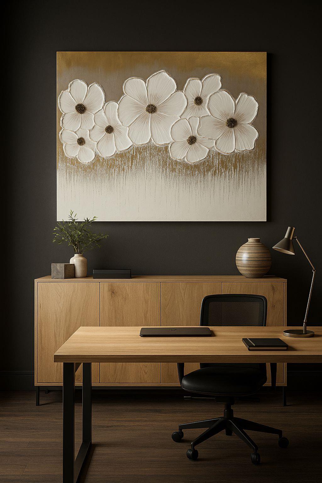 95x120 cm Gold Beyaz Çiçekler 3D Yoğun Yağlı Boya Dokulu Tablo